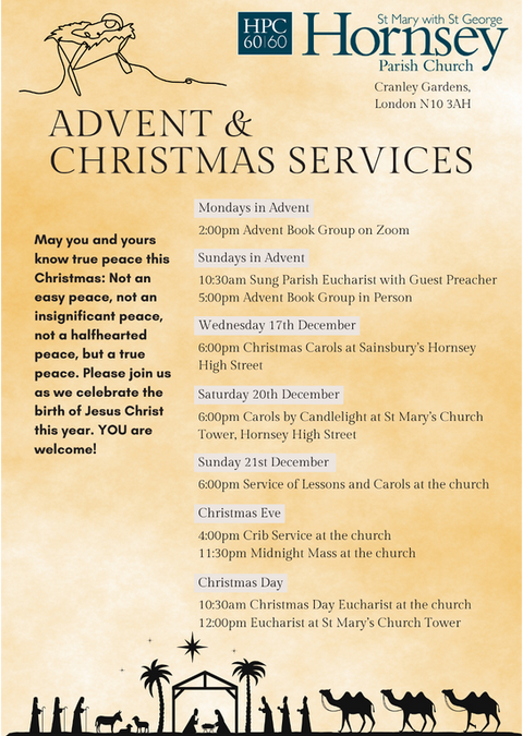 The Hornsey Pensioners Action Group is hosted in our Church Hall on the third Wednesday of each month. The next meeting is on Wednesday 11th December. Doors open in the Church Hall from 1.00 pm. You could come to Welcome Wednesday lunch at 12 noon, and go from there.